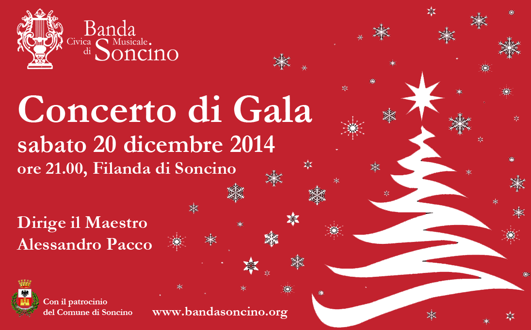 La Banda Civica Musicale di Soncino è lieta di invitarvi al Concerto di Gala che si terrà sabato 20 dicembre 2014 alle ore 21.00 presso la Filanda di Soncino, dirigerà il concerto il Maestro Alessandro Pacco. Programma di Sala: