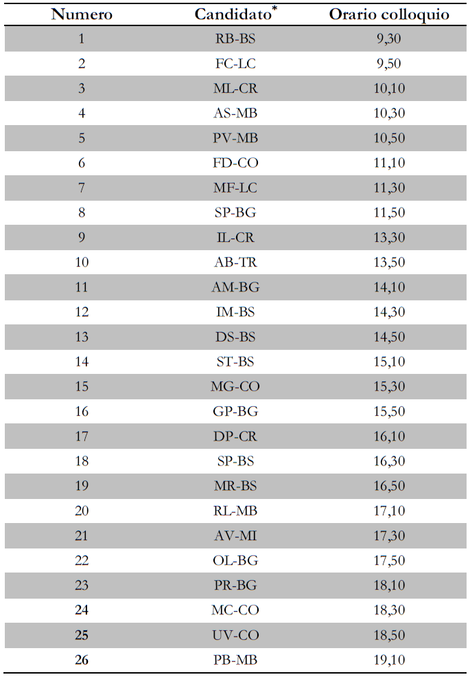 *Il codice del candidato è composto dall’iniziale del nome, del cognome, della provincia di residenze. Esempio: Mario Rossi residente in provincia di Cremona (CR) sarà MR-CR.