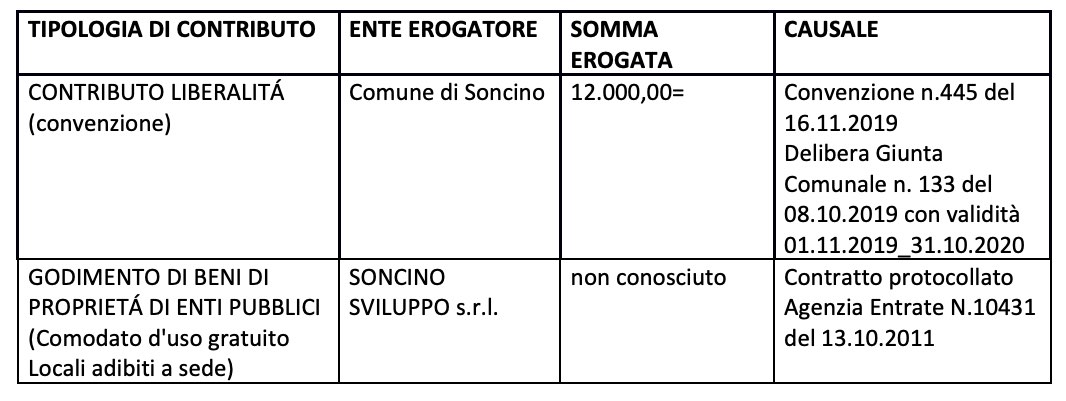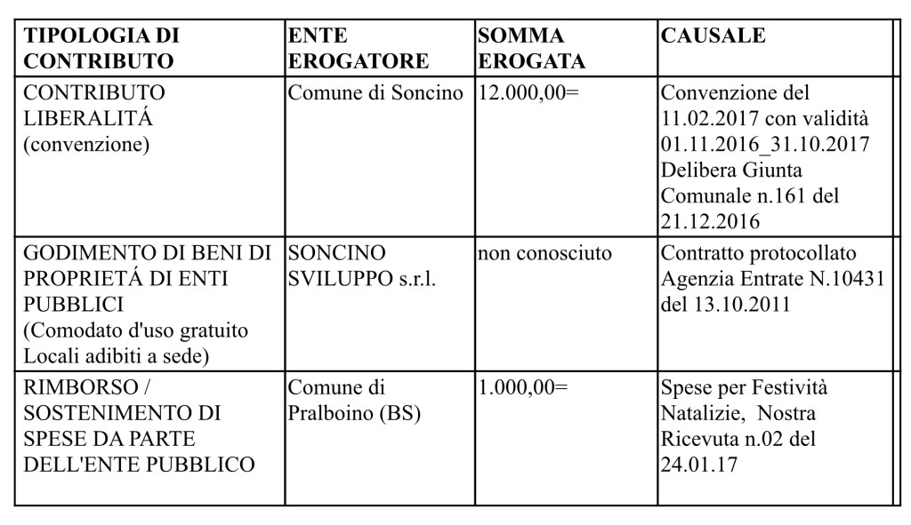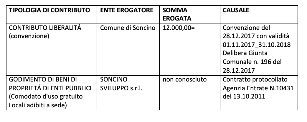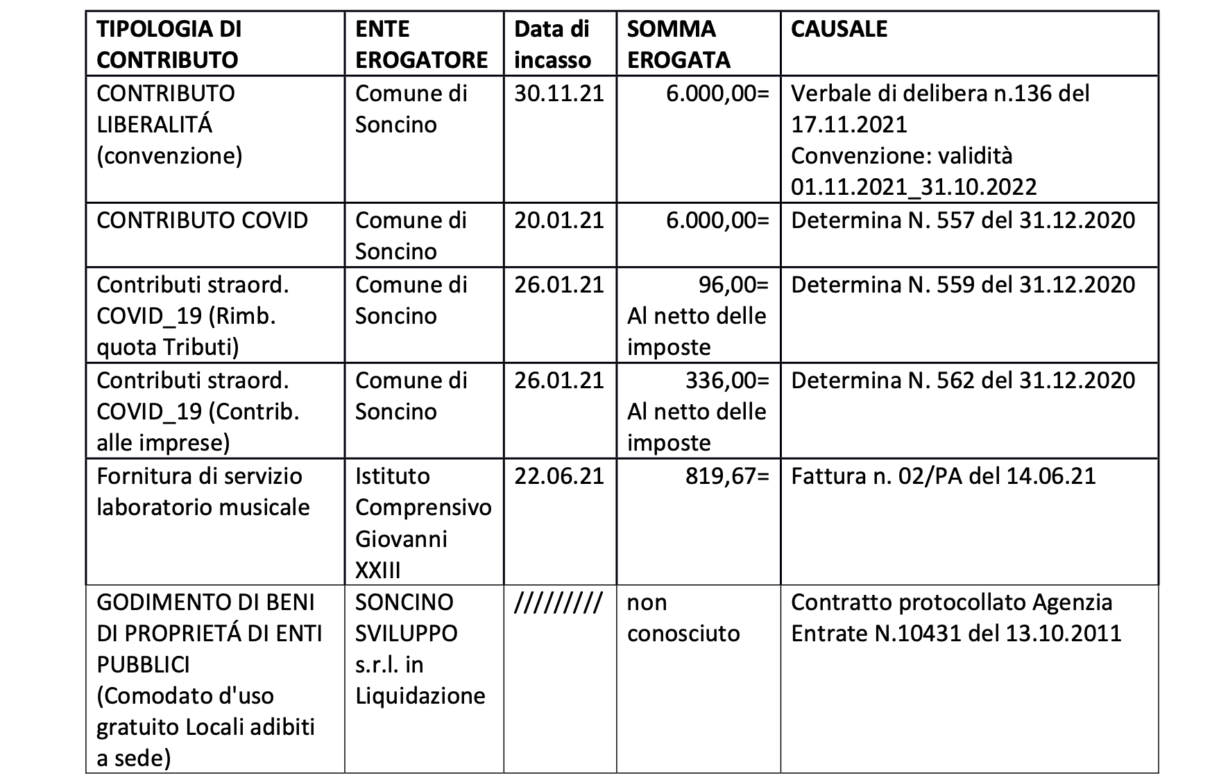 Come richiesto dall’art. 1, comma 125, della Legge 4 agosto 2017, n. 124 (Legge annuale per il mercato e la concorrenza), le associazioni devono pubblicare «entro il 28 febbraio di ogni anno, nei propri siti o portali digitali, le informazioni relative a sovvenzioni, contributi, incarichi retribuiti e comunque a vantaggi economici di qualunque genere ricevuti dalle medesime pubbliche amministrazioni e dai medesimi soggetti nell’anno precedente».