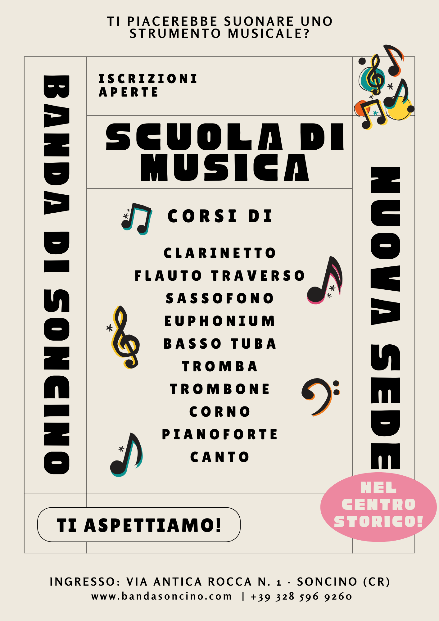 La Banda Civica Musicale di Soncino ha da anni avviato al proprio interno una Scuola di Musica con la quale provvede all’insegnamento ed alla formazione musicale di bambini, ragazzi ed adulti. La Scuola di Musica ha la funzione di istruire i giovani nelle specifiche discipline musicali, fornendo uguali opportunità didattico-musicali nel rispetto delle diversità individuali, promuovendo tutte quelle iniziative atte a stimolare e suscitare l’interesse per la musica e a sviluppare le potenzialità insite in ciascuno. Per raggiungere questi obiettivi, la Scuola di Musica si avvale ogni anno di docenti qualificati per impartire lezioni agli alunni, grandi e piccini, e dare loro una corretta impronta musicale.